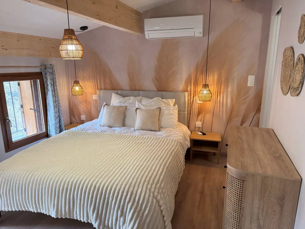 chambre double : Télévision , WIFI, salle de bains avec lavabo miroir et douche , sèche-cheveux , clim reversible, avec un lit de 1m60 , un dressing et un coin bureau coiffeuse . un wc sur le même palier .